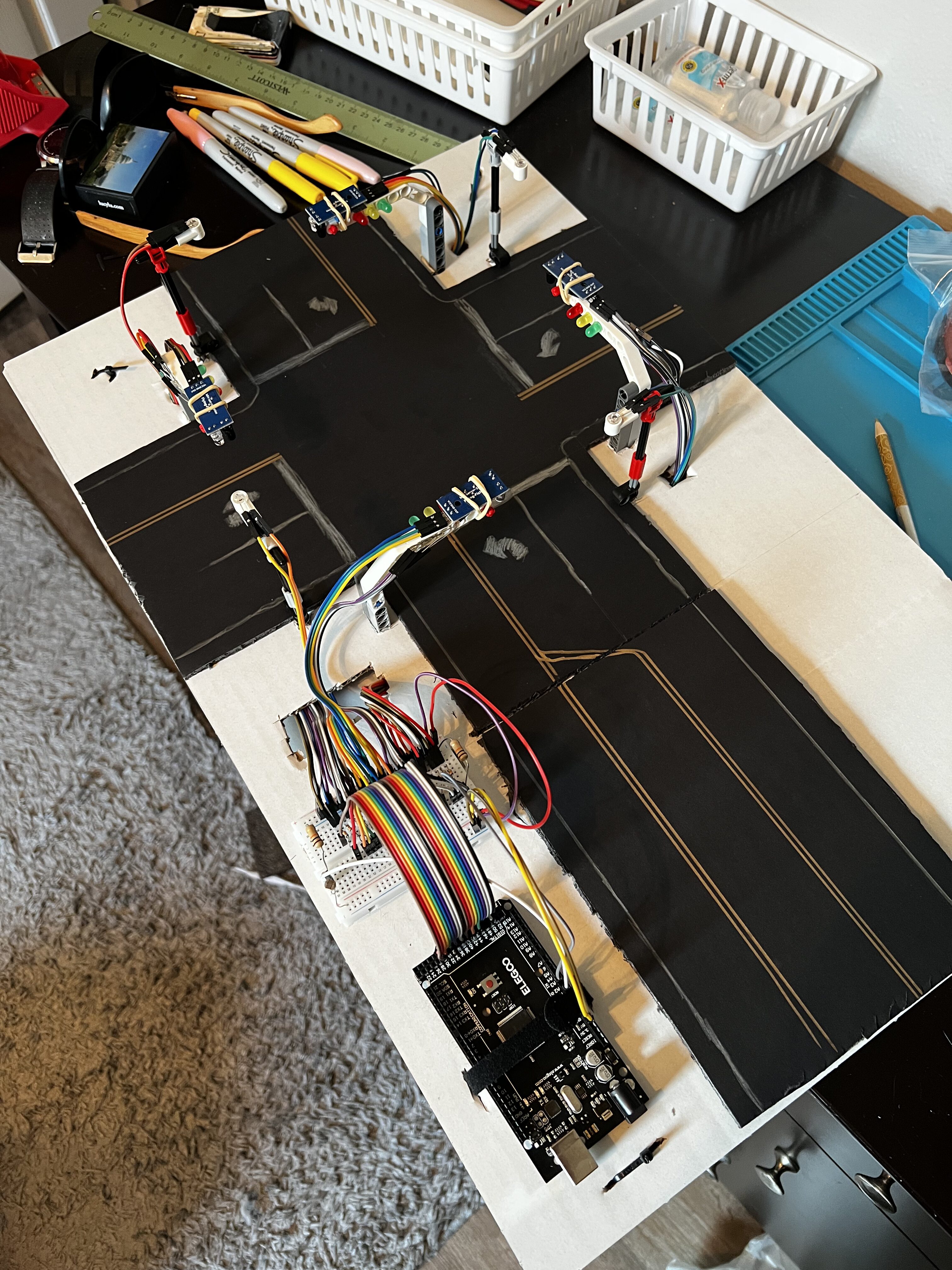 While my professor taught me how to use all the components individually and gave me guidelines for what my system had to do, such as cycle through red, green, and yellow LEDs like a real system and use sensors to light up mini street lamps when it got dark, I was left to my own ingenuity to figure out how to combine all these different pieces to work how I wanted.