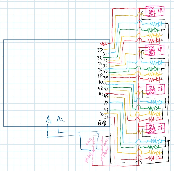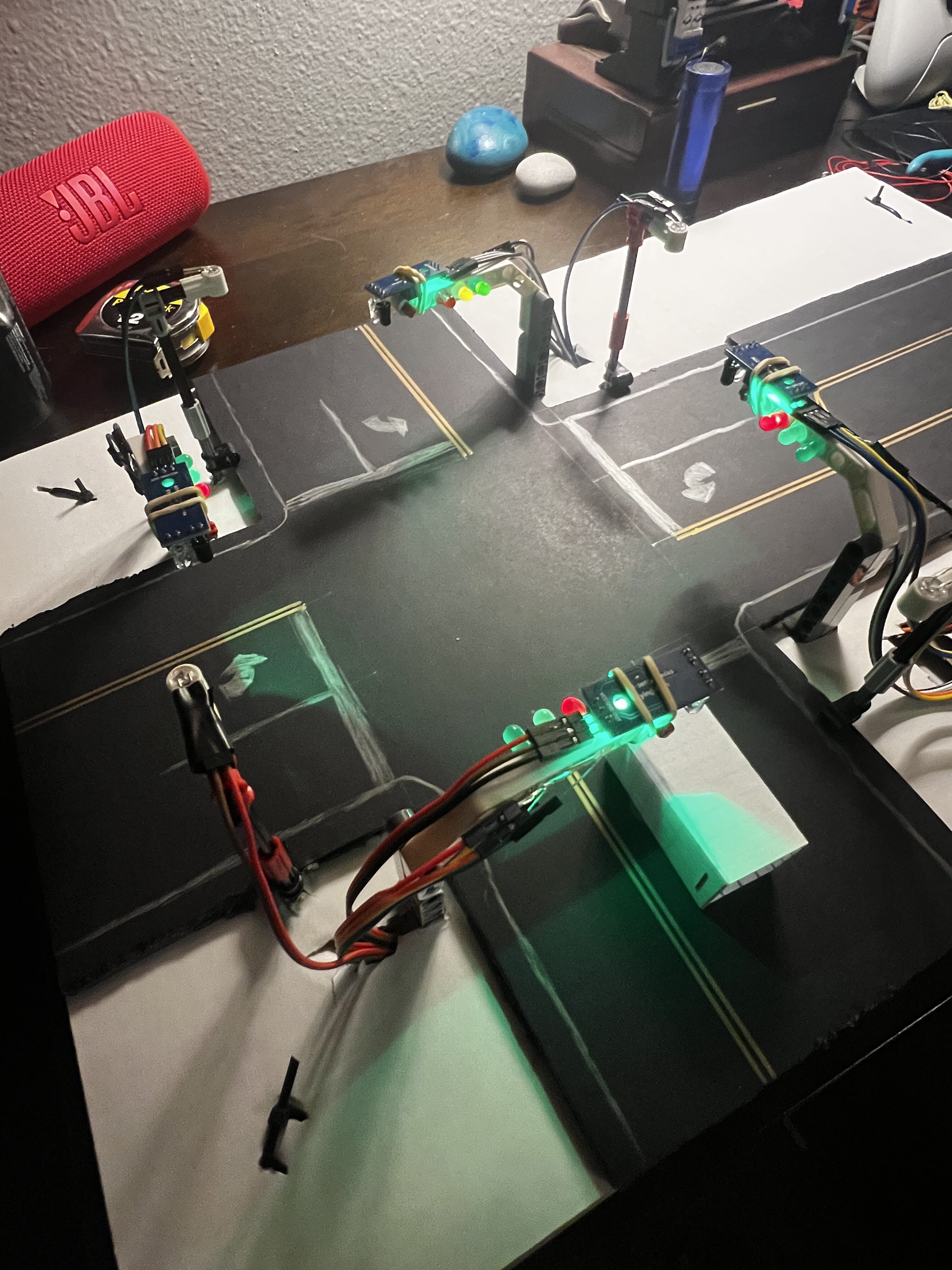 This project tasked me with designing, coding, and constructing a mini scale traffic light system for a four-way intersection, including left turn lanes. The system should cycle through green to yellow to red LEDs like a real traffic light. Using some sort of sensor, the system should be able to detect a vehicle in the left lane and, when the cycle gets to that light’s green cycle, turn on both green and yellow to indicate a left turn arrow. Finally, the system should use photo resistors to detect when light levels are low and turn on four clear LEDs.